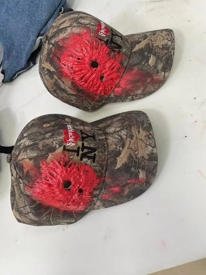 Camouflaged hat, snap back, adjustable and fits all sizes with bloodshot affect
