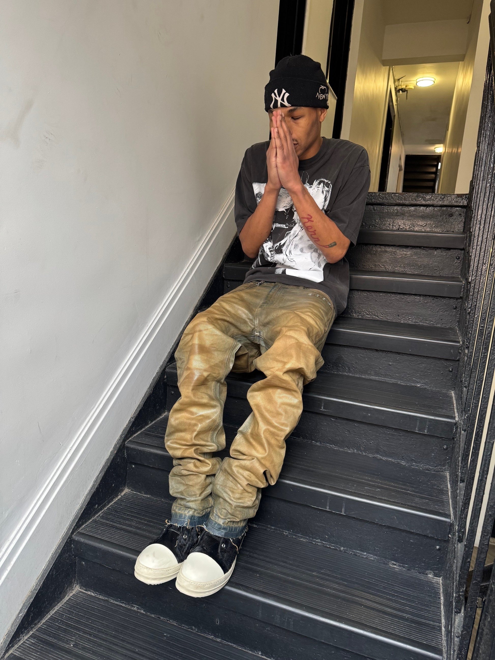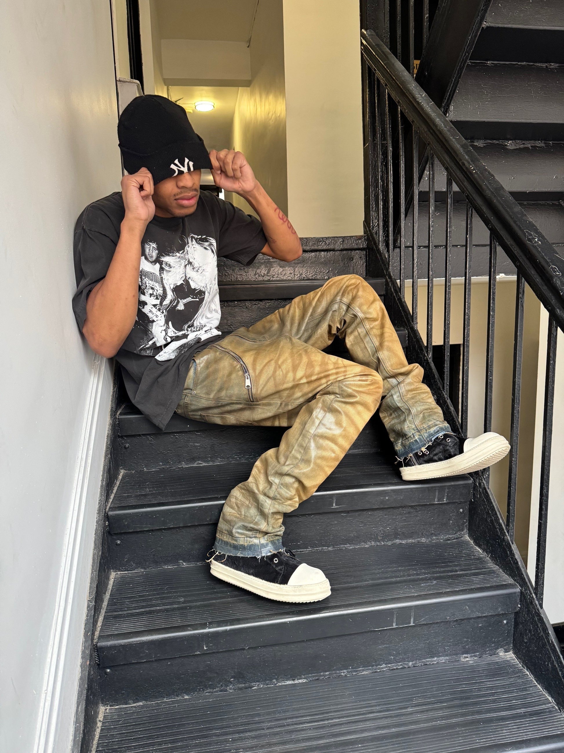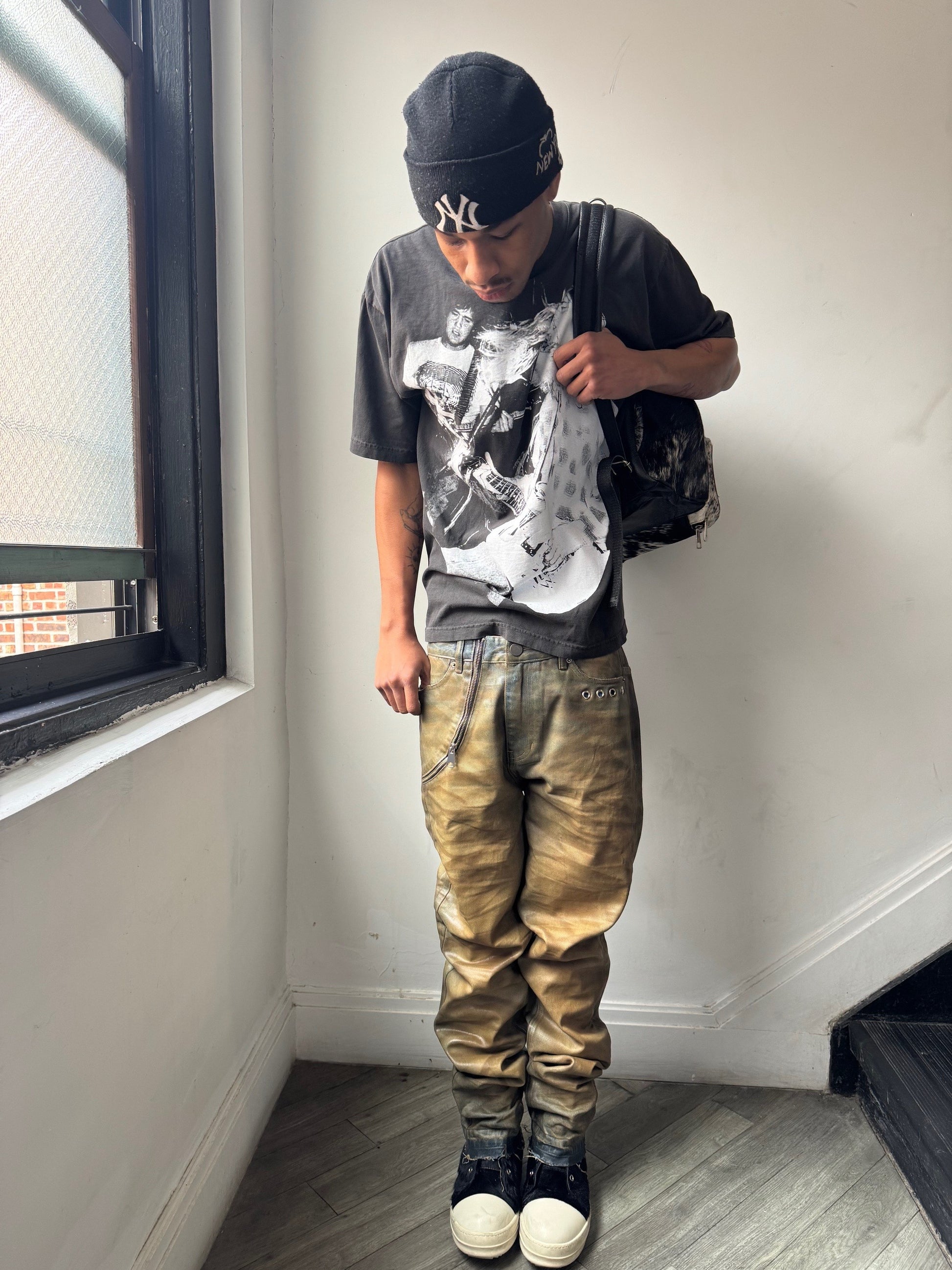 Waxed denim with rust affect. Double hem at the bottom. Eyelets on the left. Functional zipper on the right. Very unique design.